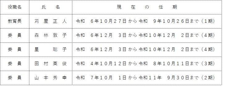 教育委員会は、教育長と4人の教育委員による合議制の委員会であり、その事務を補助するため、教育委員会事務局が設置されています。教育長の任期は3年、教育委員の任期は4年となっています。